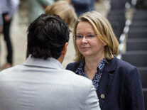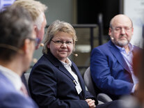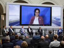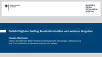 Am Nachmittag ging es um die aktuellen Entwicklungen beim Digitalen Zwilling Bundesfernstraßen. In ihrem Impulsvortrag erläuterte Claudia Oberheim, Leiterin des Referates StB 27 Straßenverkehrstelematik, Rastanlagen, Digitalisierung und IT im Straßenbau im Bundesministerium für Verkehr, das Zielbild sowie das weitere Vorgehen bei der Erstellung des Masterplans Digitaler Zwilling Bundesfernstraßen. In der anschließenden Diskussion tauschten sich Vertreterinnen und Vertreter vom Bund, aus den Ländern sowie aus weiteren Organisationen zu Herausforderungen und Potenzialen des Digitalen Zwillings aus und beantworteten die Fragen der Teilnehmenden vor Ort und online.